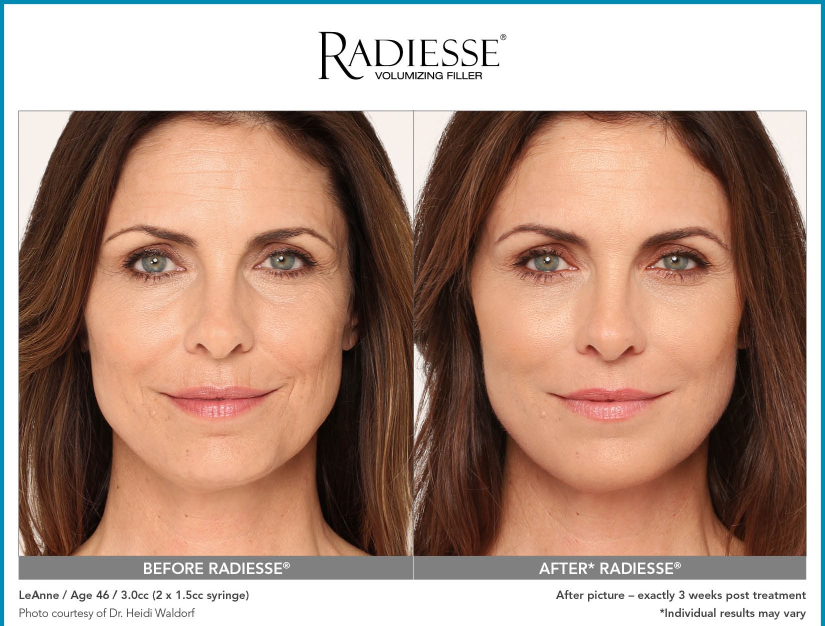 Even longer lasting is Radiesse®, which is calcium hydroxyapatite, the same component that provides structure in the bone. Injected underneath the skin, it stays soft and lasts 2+ years. Its main advantage is its long duration. This requires a numbing injection prior to injection of the Radiesse® under the skin.